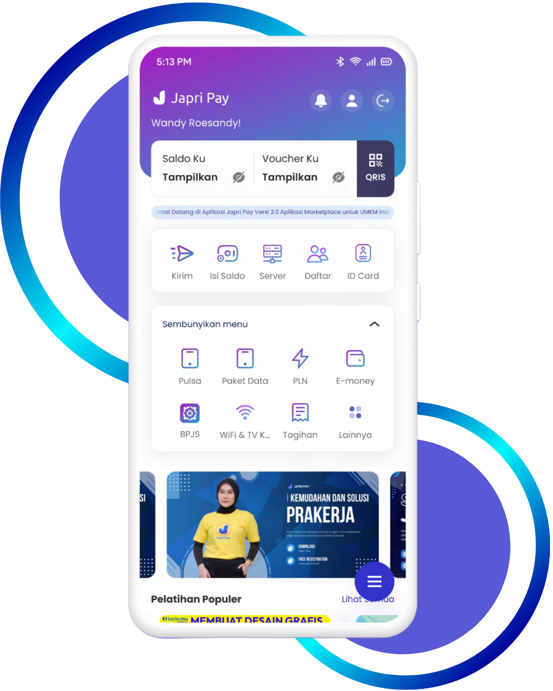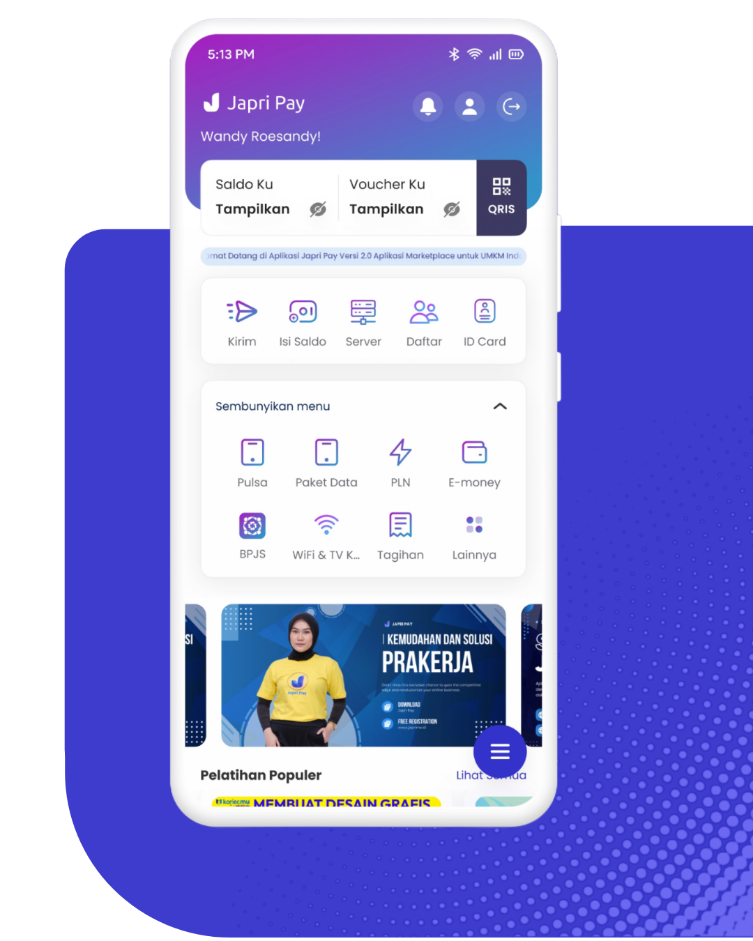 JapriPay mendukung berbagai metode pembayaran, termasuk QRIS, saldo digital, dan transfer bank.